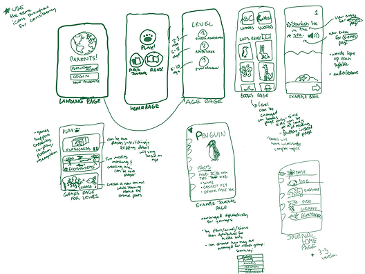 Early sketches focus on establishing user flows and wireframe layouts, focusing on features that facilitate co-learning with parents and peers.